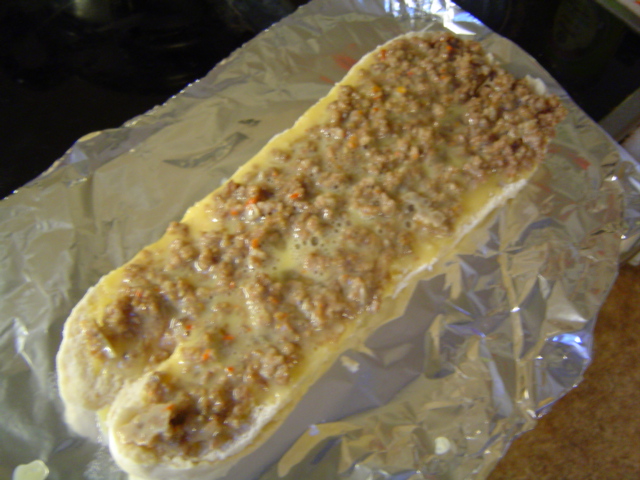 My most recent find is a Sainsbury's Basics part-baked baguette that I had left forgotten. The first idea that came to mind that involved both this and mince was Roti John, which I covered some time ago. In the interest of variety though, I decided to take a different approach, baking the baguette sliced in half, topped with the already cooked mince drenched in egg.